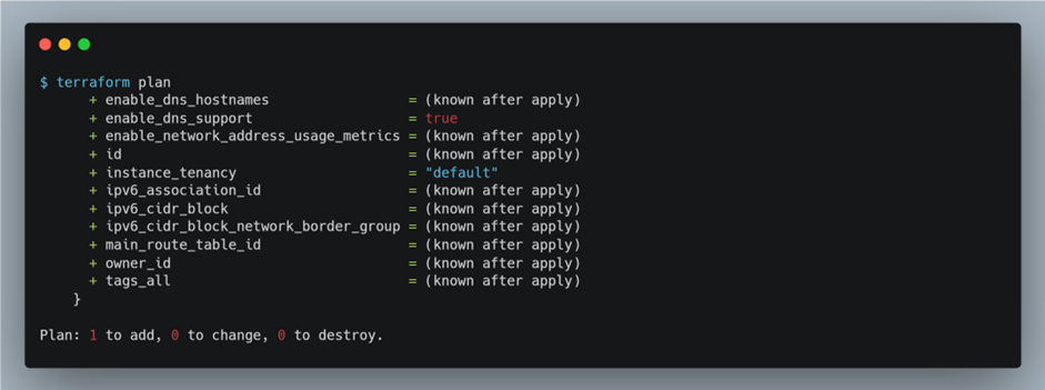terraform plan명령어를 실행하여 테라폼 결과를 미리 확인합니다. 테라폼으로 생성할 VPC가 현재 없으므로, VPC를 생성하는 +아이콘이 보입니다.