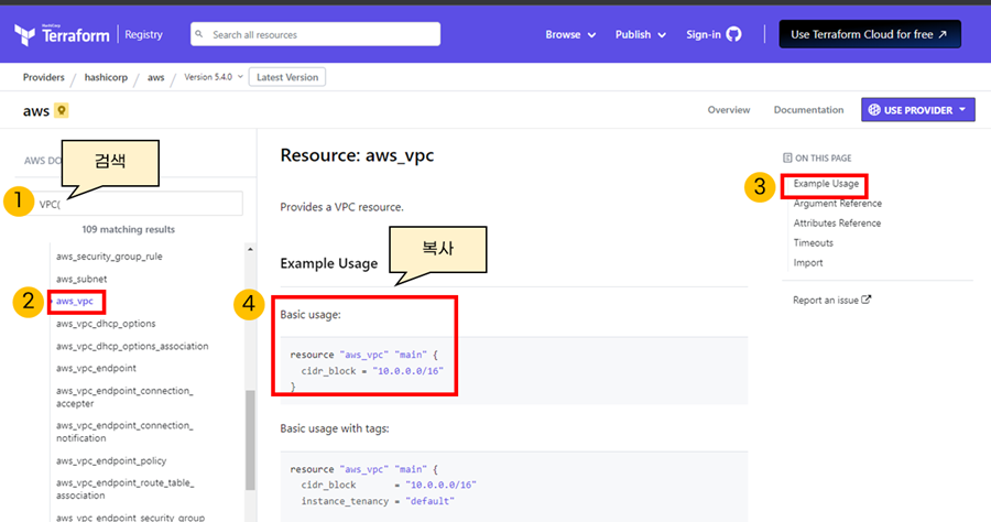 VPC테라폼 코드는 AWS 레지스트리 문서에서 찾을 수 있습니다. 예제코드를 찾아 복사합니다.