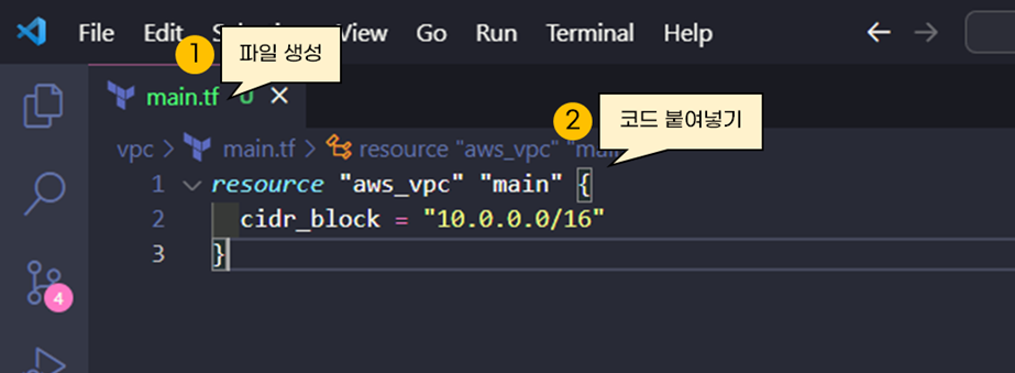 main.tf파일을 만들고 복사한 코드를 붙여넣습니다.