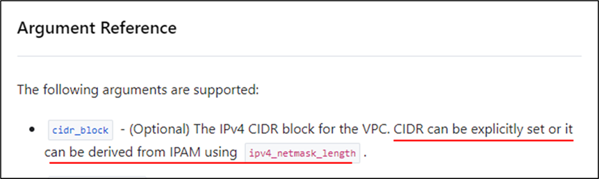 선택인자 중에서도 꼭 사용해 할 때가 있습니다. 대표적인 예가 aws vpc block의 cidr_block인자입니다. IPAM을 사용하지 않으면 cidr_block인자를 반드시 사용해야 합니다.