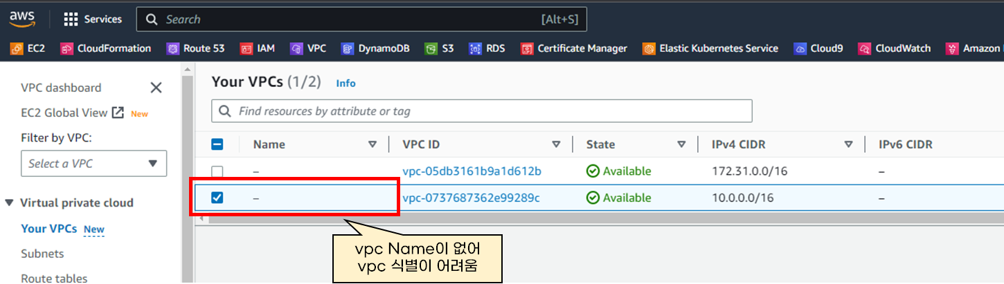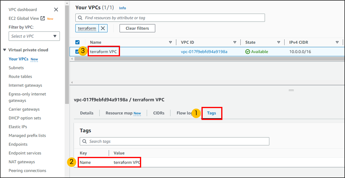 VPC가 여러개 있는 경우, vpc tag의 Name을 설정하여 vpc를 구별합니다. 이전 챕터에서 만든 vpc는 Name이 없습니다. 그래서 vpc 식별이 어렵습니다. vpc 식별을 위해, 테라폼 코드에 tag Name을 추가해야 합니다. tag Name은 block 인자(Argument)로 설정합니다.