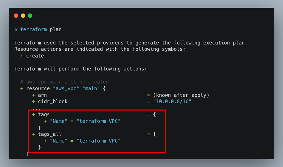 terraform plan명령어를 실행하여 vpc 태그가 생성되는지 확인합니다.