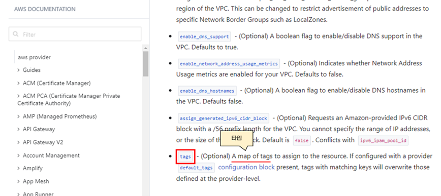 vpc 공식문서를 참조하면 tag인자는 map타입입니다. map 타입이므로 key=value형태로 코드를 작성하면 됩니다.