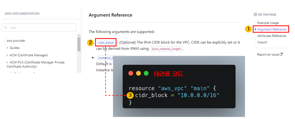 Block 인자는 block수행할 세부내용입니다. 예를 들어 vpc resource block은 cidr을 설정하는 cidr_block 인자가 있습니다. 각 block의 인자는 다르므로 아래 그림처럼 공식문서를 참조해야 합니다.
