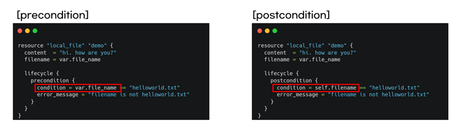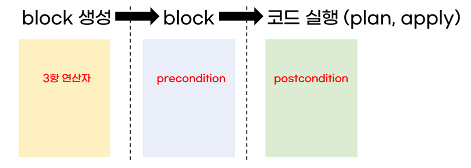 ① precondition은 테라폼 코드 실행 전에 block을 조건 검사합니다. 반면 postcondition은 코드 실행 중과 코드 실행 후에 커스텀 조건을 검사합니다. precondition과 postcondition 모두 조건이 만족하지 않으면 에러를 발생시켜 테라폼 동작을 중지시킵니다.