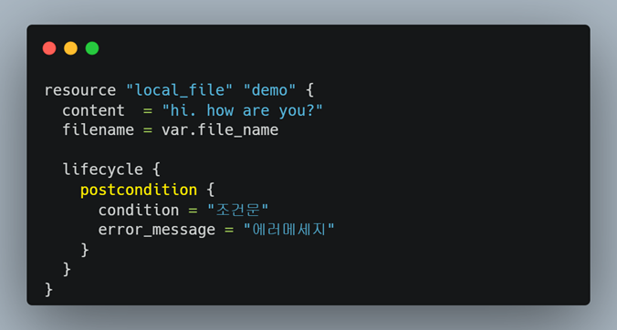 테라폼은 커스텀 조건문(custom condition)이라는 조건을 사용하여, 테라폼 코드 작성자가 의도한대로 동작하도록 도와줍니다. 조건이 맞지 않는다면 테라폼 동작을 중지시키고 에러메세지를 출력합니다.