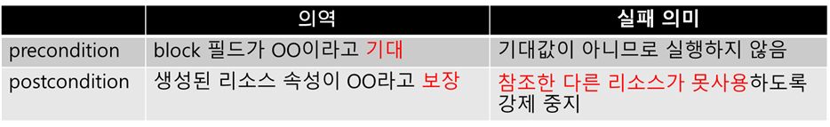 개인적으로 precondition과 postcondition의미는 기대와 보장이라고 생각합니다. postcondition은 리소스가 잘못 생성되면, 다른 리소스가 참조하지 못하도록 막는 의미가 크다고 생각합니다. 그래서 postcondition은 보장이라고 생각했습니다.