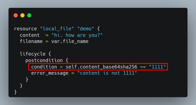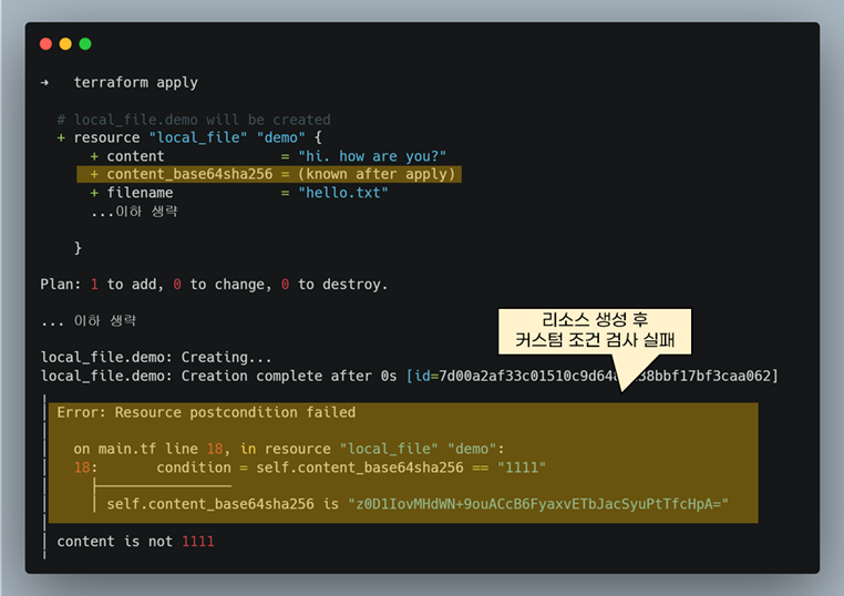예제 테라폼 코드를 자세히 보시면 리소스 생성 후, content_base64sha256값이 111인지 검사합니다. sha256해시 값은 절대로 111일 수 없어서 커스텀 조건 검사가 실패합니다.
