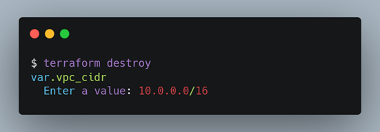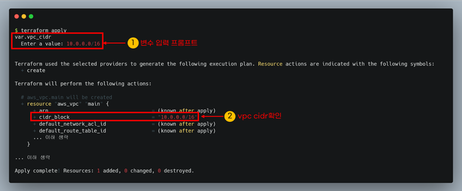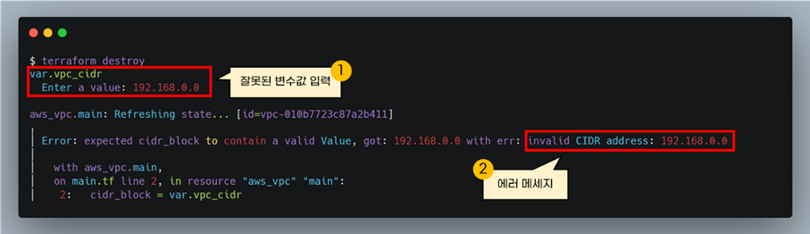 예를 들어, aws provider를 사용하여 vpc를 생성한다고 가정해봅시다. 입력 프롬프트 단계에서 잘못된 vpc cidr을 설정하면, 유효성검사가 실패하여 에러를 발생시킵니다.