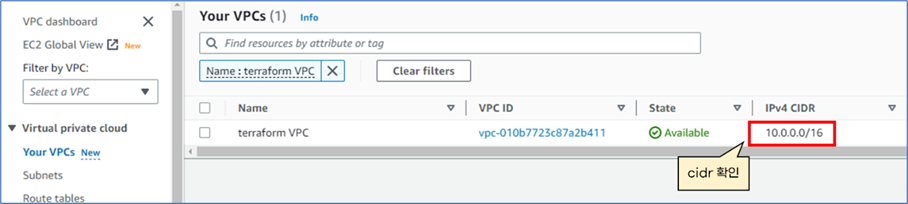 aws 콘솔에서 vpc가 잘 생성되었는지 확인합니다. 그리고 cidr도 입력 프롬프트에 입력한대로 설정되었는지 확인합니다.