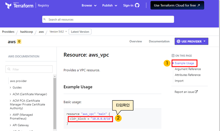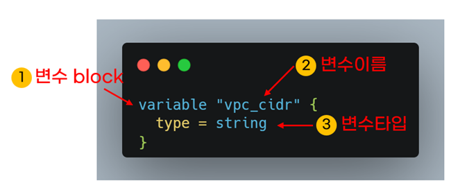 아래 예제는 vpc_cidr변수를 정의합니다. 변수타입은 string입니다.