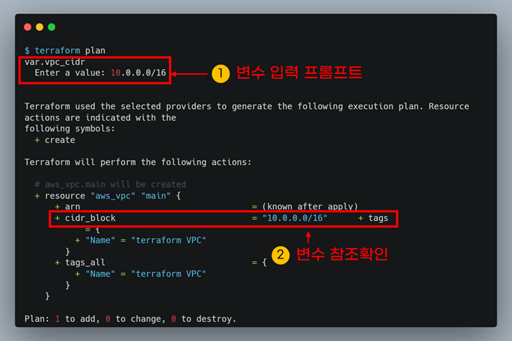 변수 값은 테라폼을 실행할 때 초기화합니다. 테라폼을 실행하면 변수 값을 초기화하는 입력 프롬프트가 나옵니다. 아래 예제는 terraform plan명령어를 실행할 때 변수 값을 초기화 합니다.