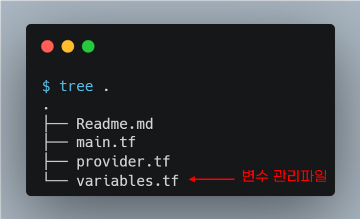 테라폼 변수는 관습적으로 variables.tf파일에 코드를 작성합니다. variables.tf파일로 모든 변수를 관리하면, 처음 보는 사람도 무슨 변수를 사용하는지 확인할 수 있습니다.