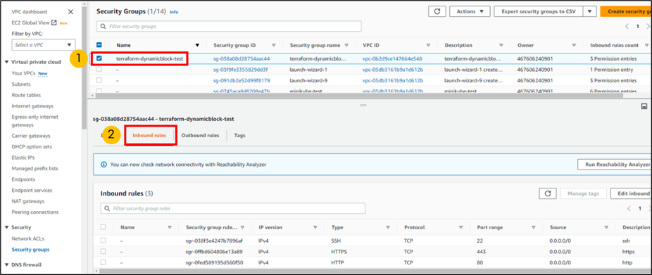 aws 콘솔에서 security group이 의도한대로 생성되었는지 확인합니다.