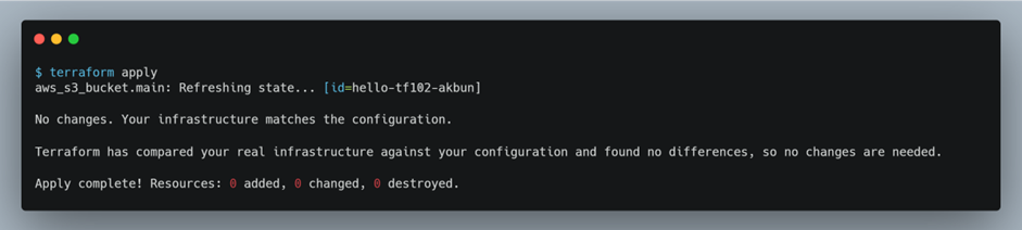 terraform apply명령어를 실행하면 아무 변화가 없습니다. state에는 버킷이 있고 aws도 이미 버킷(첫 번째 예제에서 생성)이 있기 때문에, 테라폼은 아무런 동작을 안 했습니다.