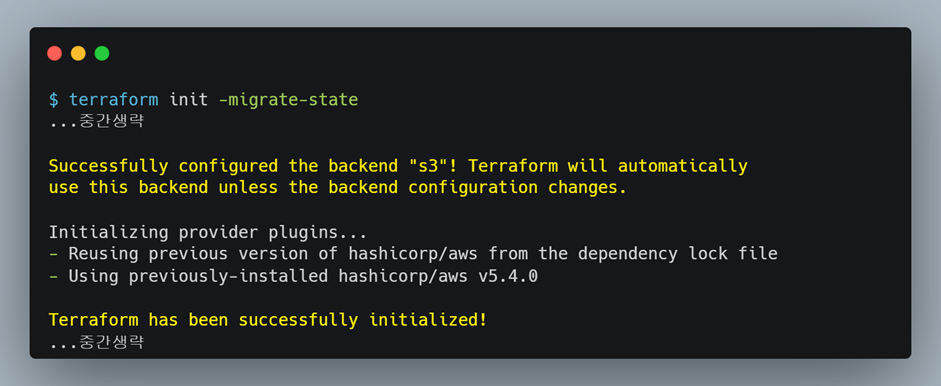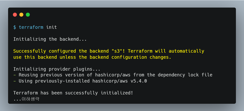 테라폼을 초기화 과정에서 s3와 잘 연결되는지 확인합니다.