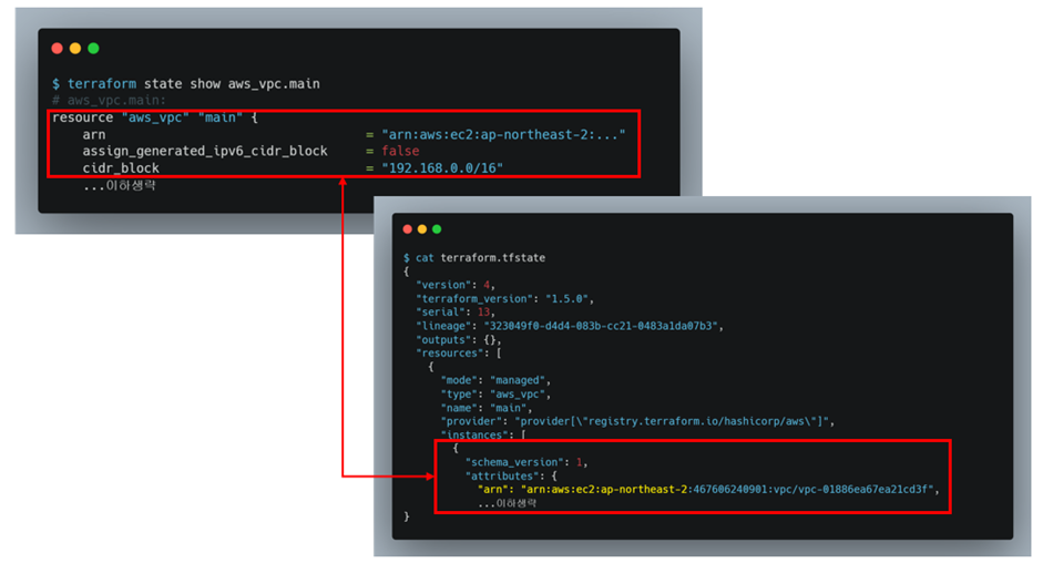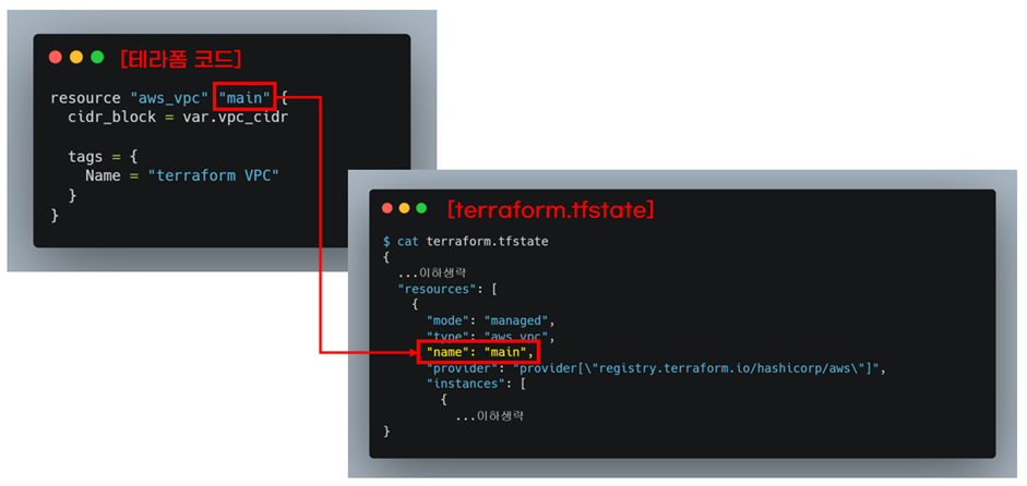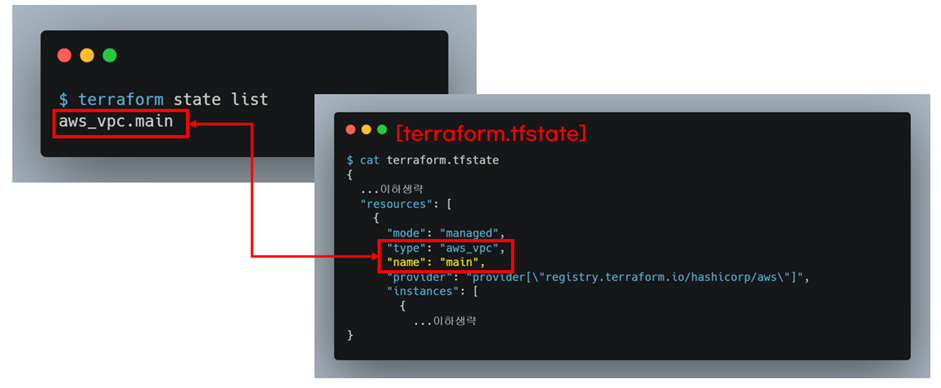 state파일에는 테라폼이 생성한 vpc정보가 있습니다. 테라폼이 관리하는 리소스 갯수만큼 state가 생성되고 name(block label)로 구분합니다.