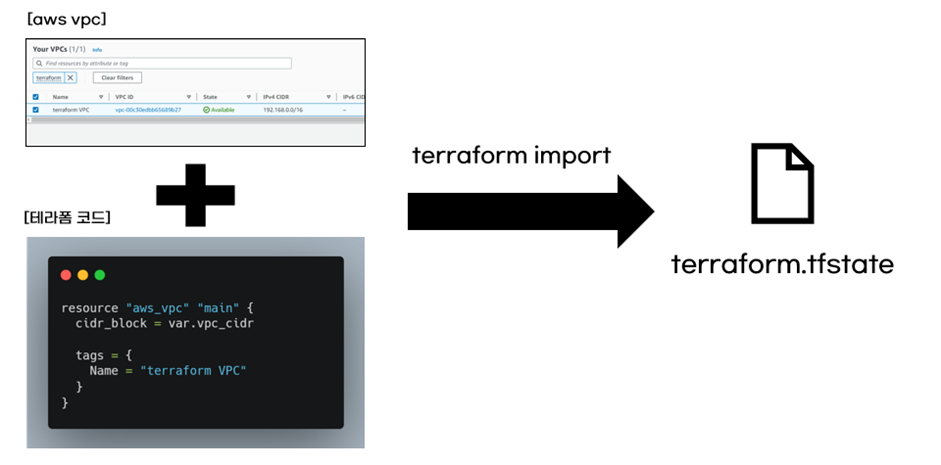 terraform import를 사용하기 위해서 테라폼 코드와 대상에 리소스가 존재해야 합니다. terraform import명령어를 실행하면 대상 리소스를 테라폼 코드에 매핑 시켜 state를 업데이트 합니다.