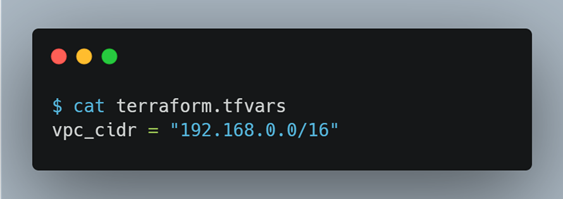 예제코드는 vpc를 생성합니다. vpc cidr를 테라폼 변수로 입력 받습니다. 저는 terraform.tfvars로 변수 값을 초기화 했습니다.