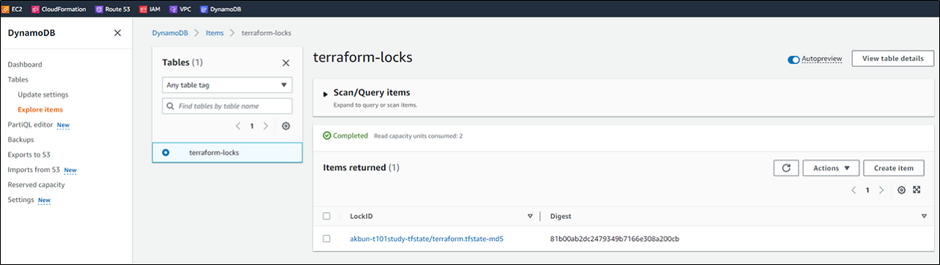 이제 s3에 있는 remote_state를 업데이트 하기 전 locking을 통과해야 합니다. vpc이름을 수정해보고 terraform apply을 실행해보세요. 그리고 동시에 DynamoDB table 필드를 관찰하면 locking필드가 생겼다가 없어집니다.