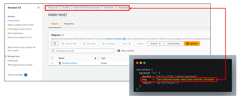 terraform apply이후에 업데이트된 state는 s3에 저장됩니다. s3경로는 테라폼 코드 backend에 설정한 경로와 일치합니다.