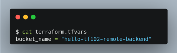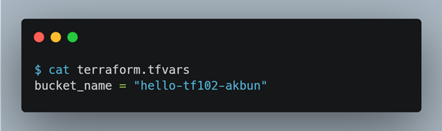 버킷 이름은 변수로 입력받습니다. 저는 tfvars파일로 변수 값을 초기화 했습니다. 예제를 실행할 때 꼭 버킷 이름을 변경해주세요.