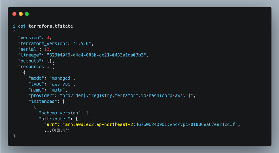 테라폼 실행 후 파일목록을 확인하면, terraform.tfstate파일이 있습니다. 파일 내용에는 json포맷인 state가 있습니다. state에는 생성한 vpc정보(예: vpc arn 등)가 있습니다.