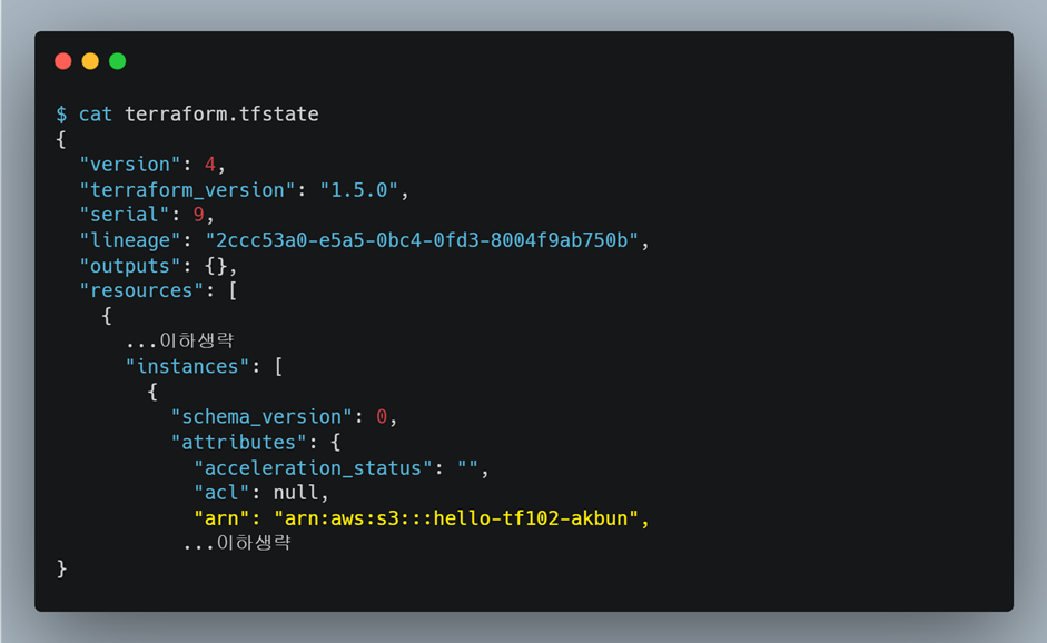 생성한 버킷 정보는 state로 관리되고 terraform.tfstate파일에 저장됩니다. 예를 들어 생성한 버킷 arn이 state에 있습니다.