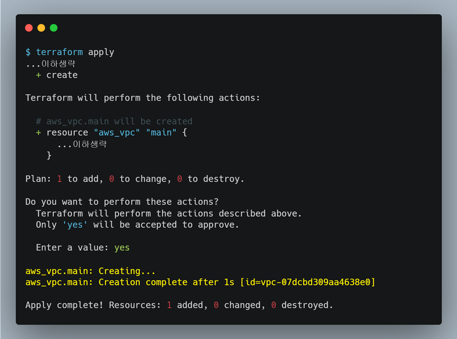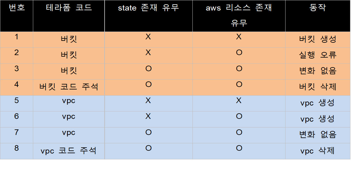 두번째 예제와 상황은 같지만 테라폼 실행결과는 다릅니다. terraform apply를 실행하면 테라폼이 정상적으로 실행되고 vpc가 생성됩니다. 그리고 생성한 vpc정보가 state파일에 저장됩니다. vpc는 버킷과 다르게 이름이 유일하지 않기 때문에, 테라폼 생성 작업이 정상적으로 실행되었습니다.