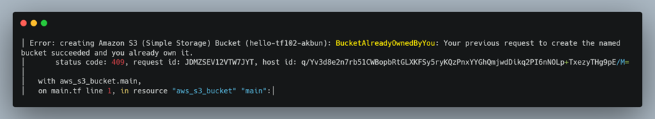 하지만 첫 번째 예제에서 버킷을 생성했으므로 버킷 이름 중복 오류가 발생합니다. 그러므로 테라폼 실행도 실패합니다.