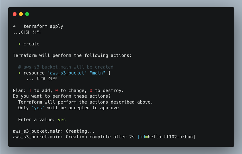terraform apply를 실행하면 버킷을 생성하는 메세지가 출력됩니다. state와 aws에 버킷이 없기 때문에 테라폼은 버킷 생성 작업을 합니다.