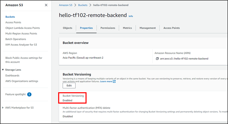 생성된 버킷은 versioning이 활성화되어 있습니다.
