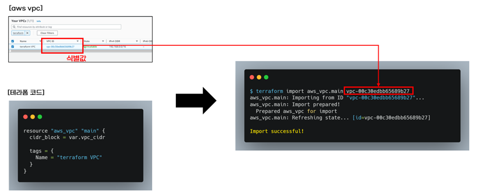 아래 예제는 aws vpc_id를 리소스 식별값으로 사용하여 terraform import를 사용했습니다.