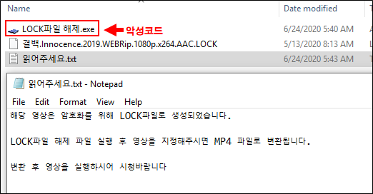 공격자는 영화를 보기 위해서 압축해제 프로그램 실행을 유도합니다. 일종의 피싱 공격이라고 분류 할 수 있겠네요. LOCK.exe를 실행하면 악성코드가 실행될 뿐 기존 영화 압축해제는 되지 않습니다.