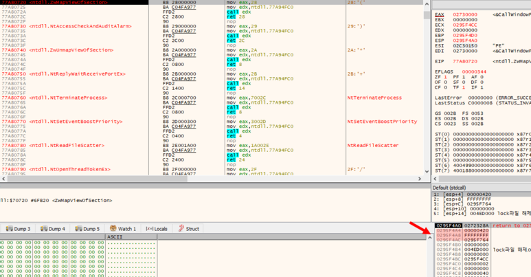 NtViewOfSection에서 브레이크포인트를 설정하고 F9를 눌러 실행합니다. 스택창을 확인하면 악성코드 자기자신에게 생성했던 섹션을 연결합니다.