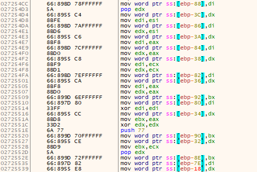 VirtualAlloc함수를 사용하여 메모리를 할당하고 코드조각(추측:쉘코드)을 초기화합니다. 총 7번 VirtualAlloc과 초기화 과정을 걸쳐 환경분석을 시작합니다.