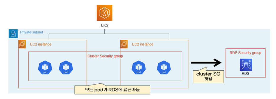 cluster SG에 규칙을 규칙을 추가하면 모든 EKS노드와 pod가 영향을 받습니다. 그래서 security SG에 필요한 규칙만 추가할 수 없습니다. 예를 들어 cluster SG에 RDS에 접근하는 규칙을 추가하면, RDS를 사용하지 않는 pod도 RDS에 접근이 됩니다.