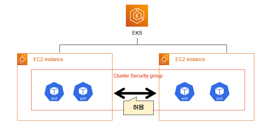 cluster SG에 설정된 기본 규칙때문에 EKS 노드간 통신은 모두 허용입니다. 그래서 pod간 통신도 모두 허용됩니다.