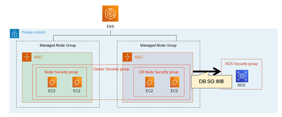 아래 예제는 RDS를 사용하는 node group을 생성했습니다. RDS에서는 RDS node group에 오는 SG만 허용하여 RDS를 사용하는 pod만 접근하게 합니다.