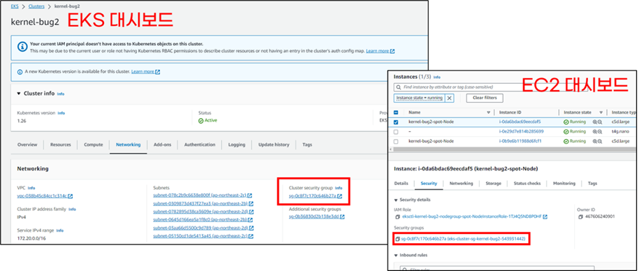 직접 AWS console에서 EKS노드가 cluster SG를 사용하는지 확인할 수 있습니다.저는 eksctl로 EKS를 생성했습니다. EKS cluster SG id와 EKS 노드가 사용하는 SG id가 일치합니다.