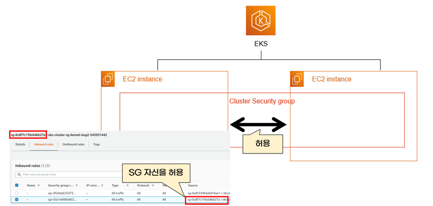 cluster SG 규칙은 outbound는 모두 허용입니다. 그리고 inbound는 cluster SG자기 자신을 모두 허용합니다. SG자기 자신을 허용하면, cluster SG를 사용하는 노드간 통신을 모두 허용한다는 의미입니다.