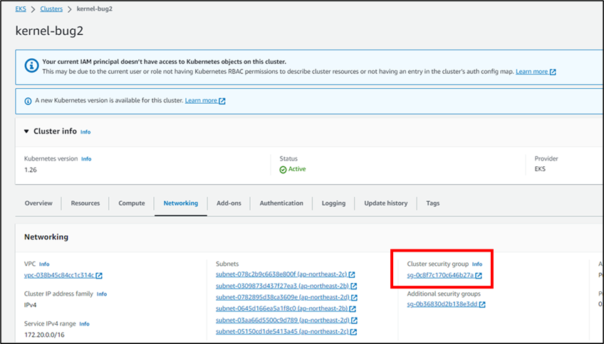 EKS를 생성하면 EKS에 적용할 cluster SG도 같이 생성됩니다. cluster SG는 [Networking -> cluster security group]메뉴에 있습니다.