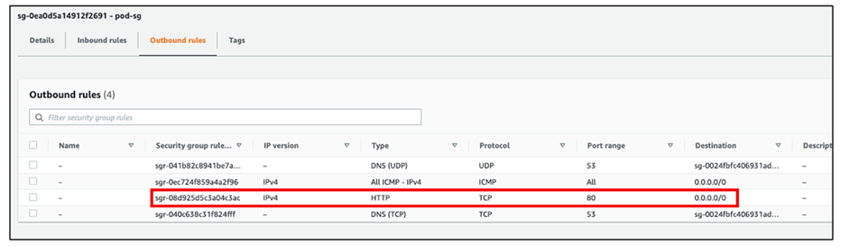 netshoot pod에 적용된 security group에는 outbound에 DNS 프로토콜 TCP/UDP를 추가합니다. 소스는 cluster security group입니다.
