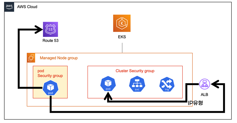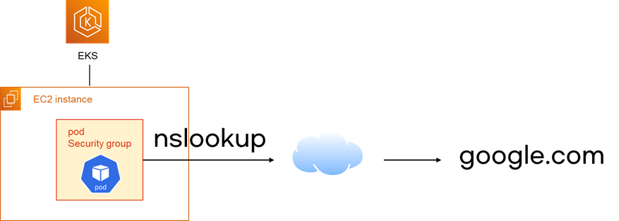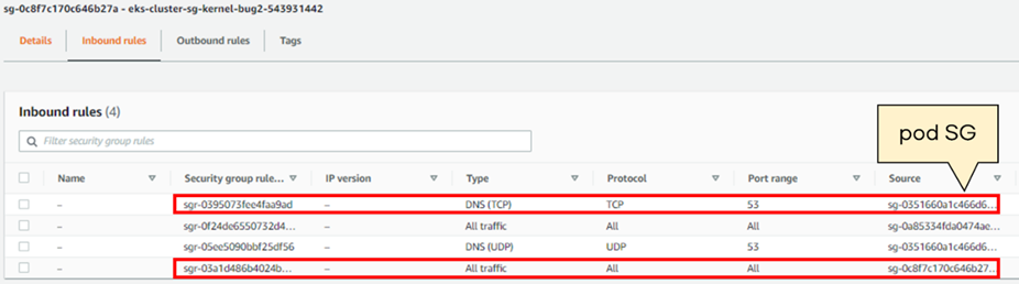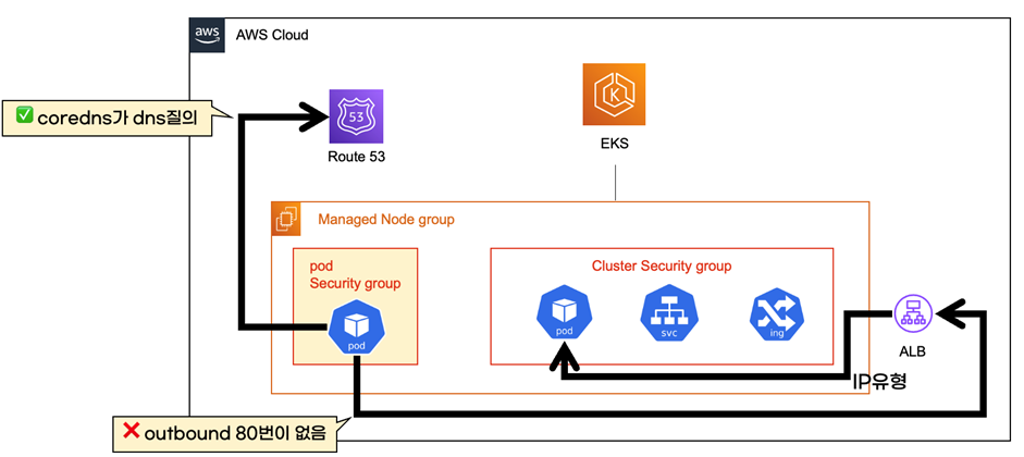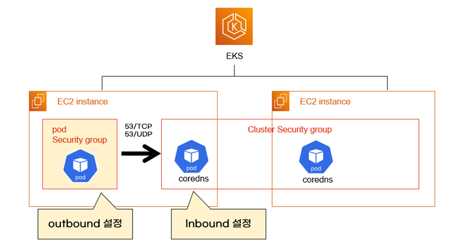 쿠버네티스에서 DNS 관리는 coredns가 합니다. coredns는 cluster security group영향을 받기 때문에, pod가 사용하는 securitygroup과 cluster security group 모두 설정해야 합니다.