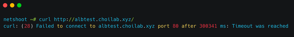 2번 테스트 시나리오에서 DNS 프로토콜을 security group에 설정했으므로 DNS는 잘 실행됩니다. 하지만 pod가 사용하는 security group outbound에 http프로토콜을 허용하지 않았으므로, netshoot -> ALB간 네트워크 통신이 되지 않습니다. 그래서 netshoot pod가 nginx를 호출하지 못했습니다.