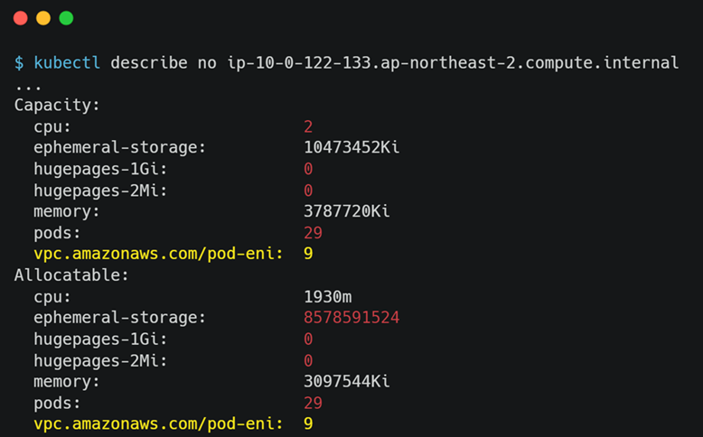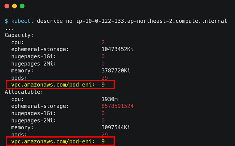 라벨이 설정된 노드를 describe해보세요. capacity필드와 allocatable필드에 pod-eni가 추가되어 있습니다.