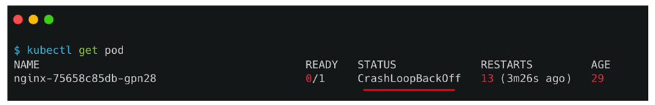 kubectl get pod로 상태를 확인하면 pod가 CrashLookBackOff 상태입니다.