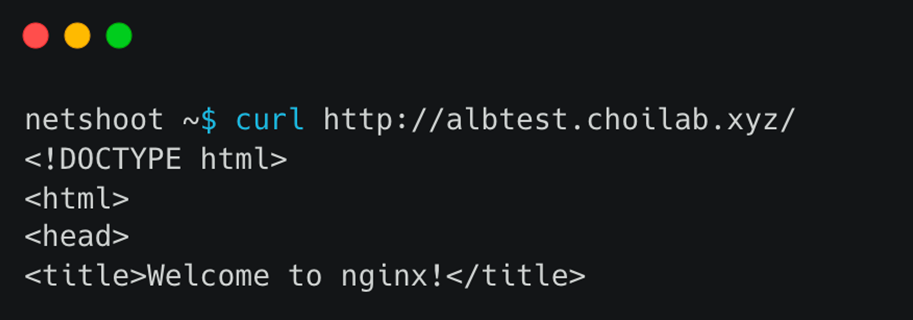 security group설정 후 netshoot에서 다시 nginx를 호출해보세요. 호출이 성공하여 welcome to nginx 응답을 받습니다.