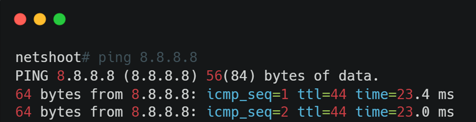 그리고 다시 netshoot pod에서 8.8.8.8에 ping을 날리면 응답을 받습니다.