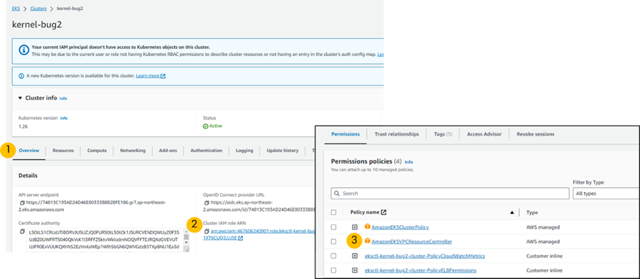 EKS IAM role에 AmazonEKSVPCResourceController Policy를 추가합니다. eksctl는 EKS 생성할 때 자동으로 해당policy를 추가합니다.